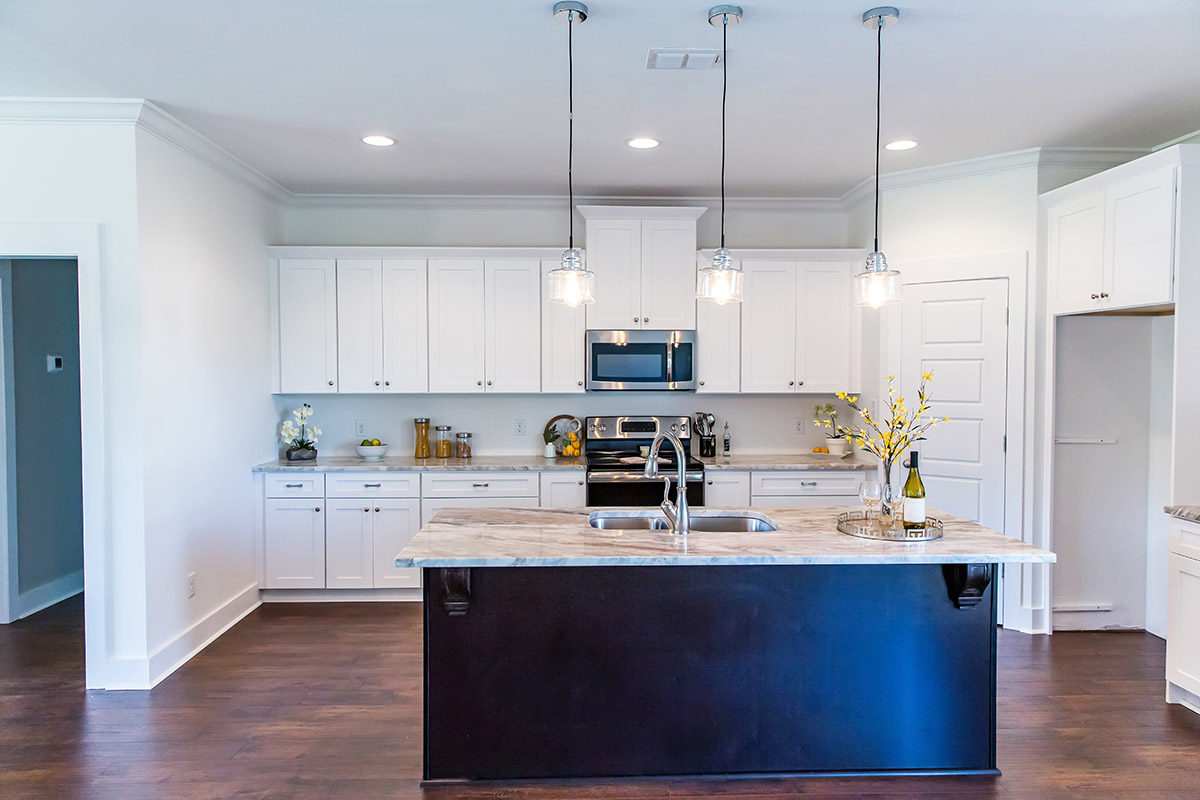 - Home kitchen interior, kitchen furniture, cooking process. Food meat, onions, cabbage on countertop of island
